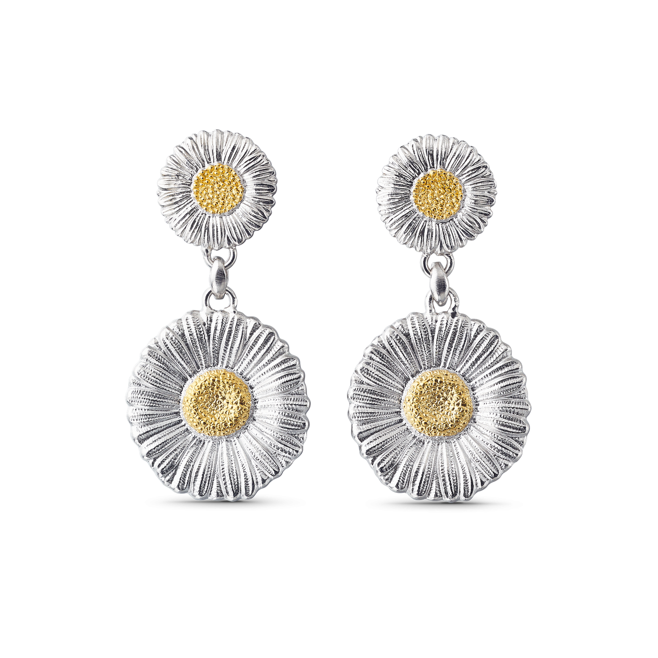 Earrings in rhodium-plated and gold-plated sterling silver. Daisy, Diameters: 2.5 cm and 3.5 cm – length 7 cm.