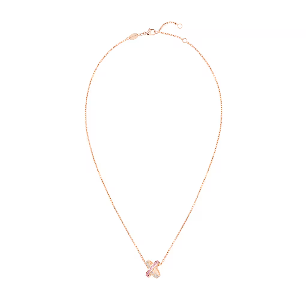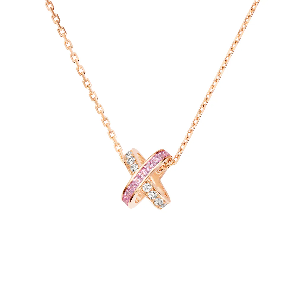 Jeux de Liens pendant in rose gold, set with brilliant-cut diamonds and square-cut pink sapphires.
