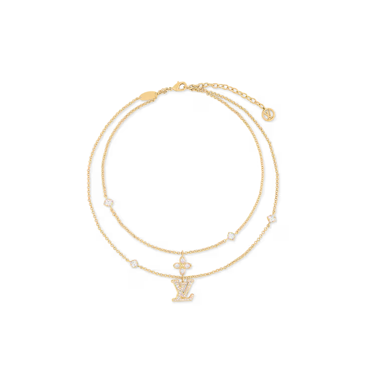 The Lady LV necklace features a double-strand design crafted in gold-tone metal enhanced with sparkling crystals. Two fine-linked chains are adorned with a Monogram Flower and an LV signature charm, symbolizing purity and feminine discretion. Four additional crystals bring an extra glint of glamour to this sumptuous, sophisticated necklace.