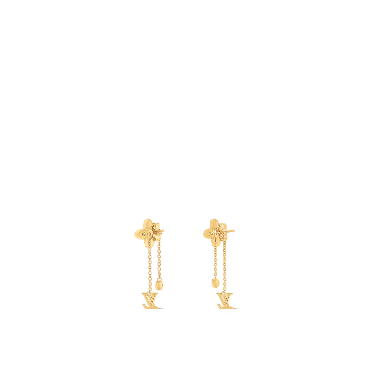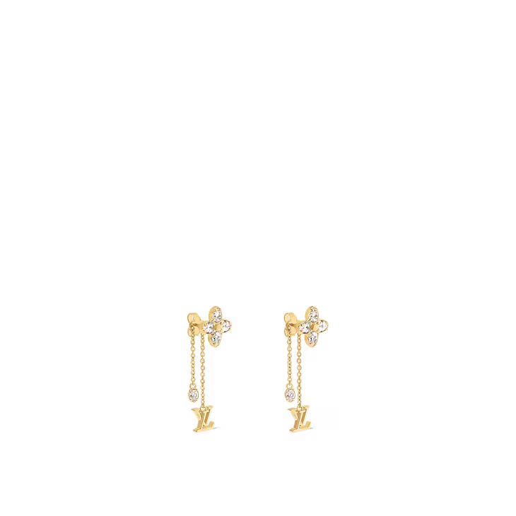 The sophisticated design of the LV Dazzle earrings combines elegant feminine styling with an original signature. A Monogram Flower stud enlivened with gleaming crystals is paired with an LV Initials pendant plus a single large crystal for an extra touch of glamour. Perfect for adding a hint of sparkle and movement to a chic outfit.