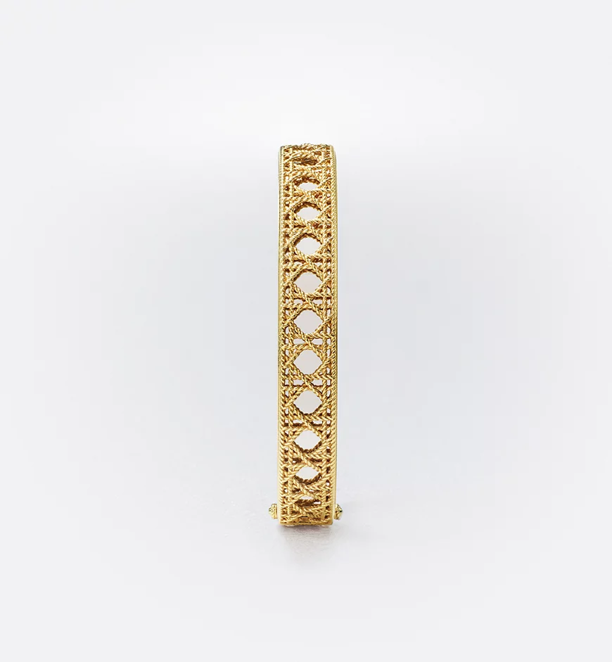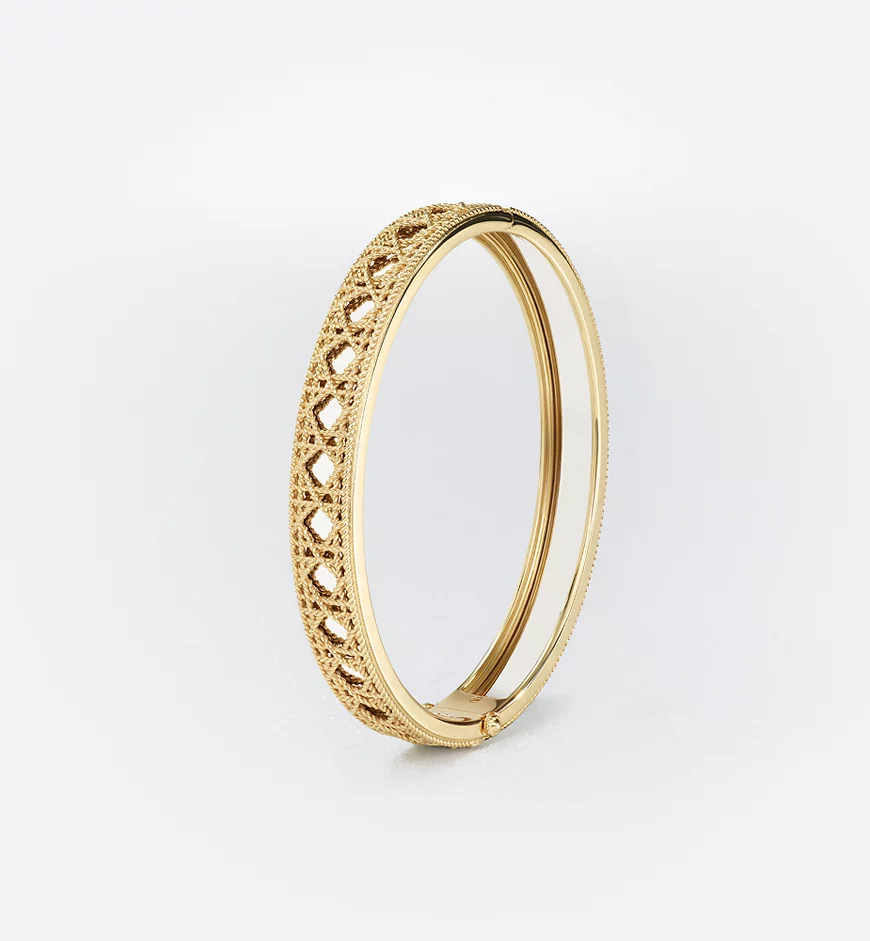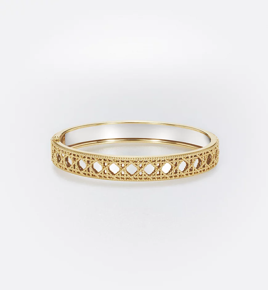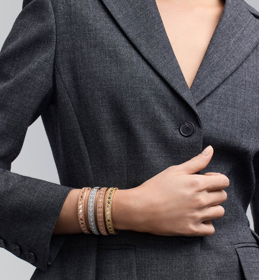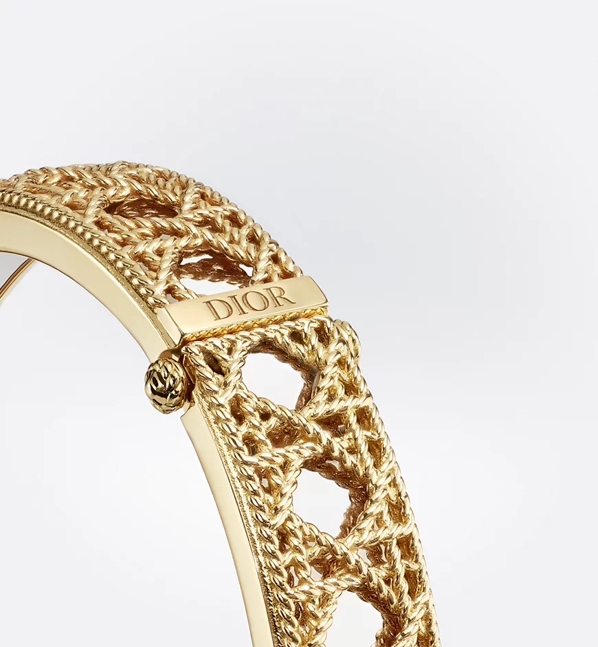 The My Dior collection by Victoire de Castellane is reinvented with a series of infinitely precious jewelry pieces. In an ode to the art of detail, a tangle of golden threads is woven together like meticulously interlaced sprigs of straw into a subtle mesh, revealing the iconic Cannage, accented by a strip of shiny gold. The craftsmanship is an homage to Dior’s refined style.