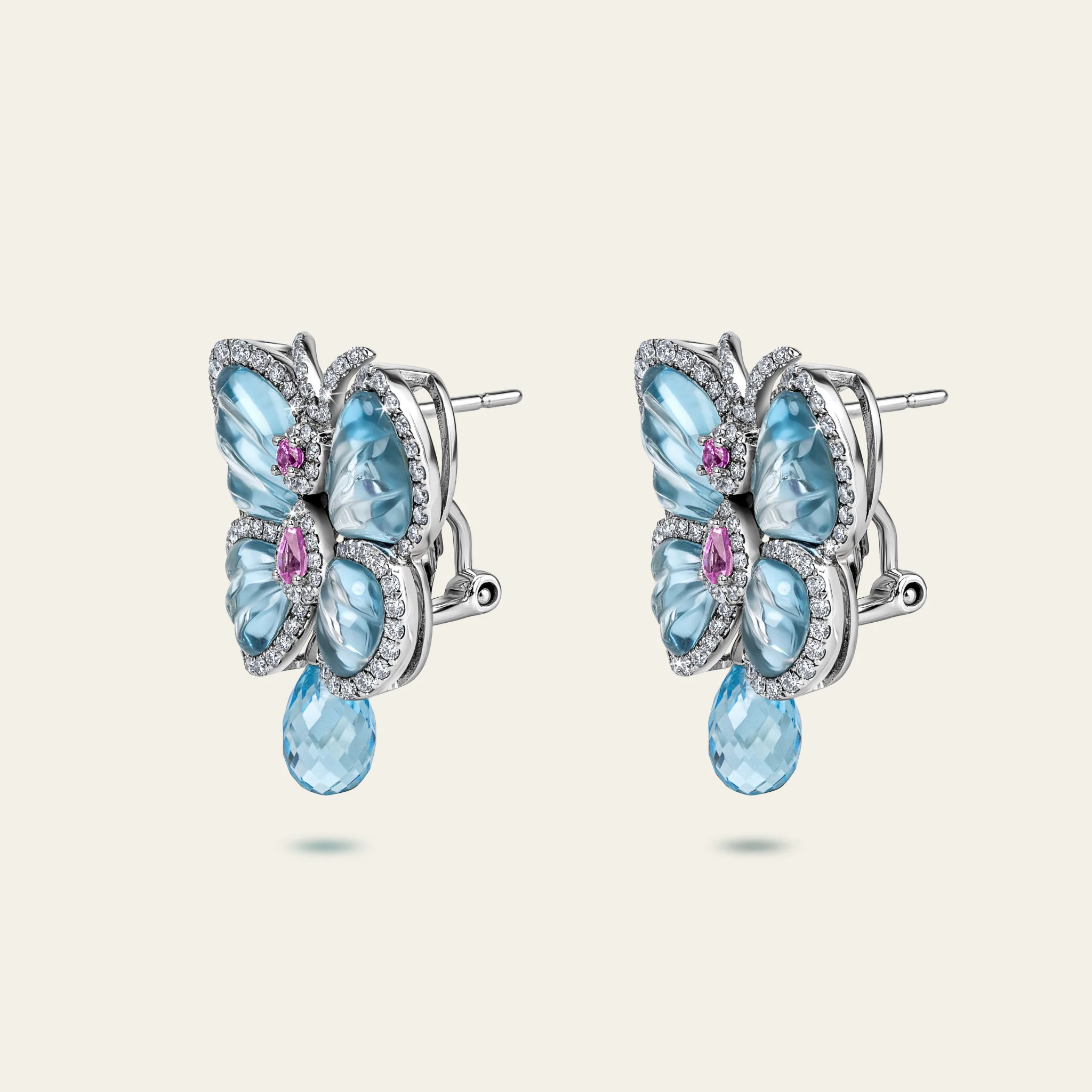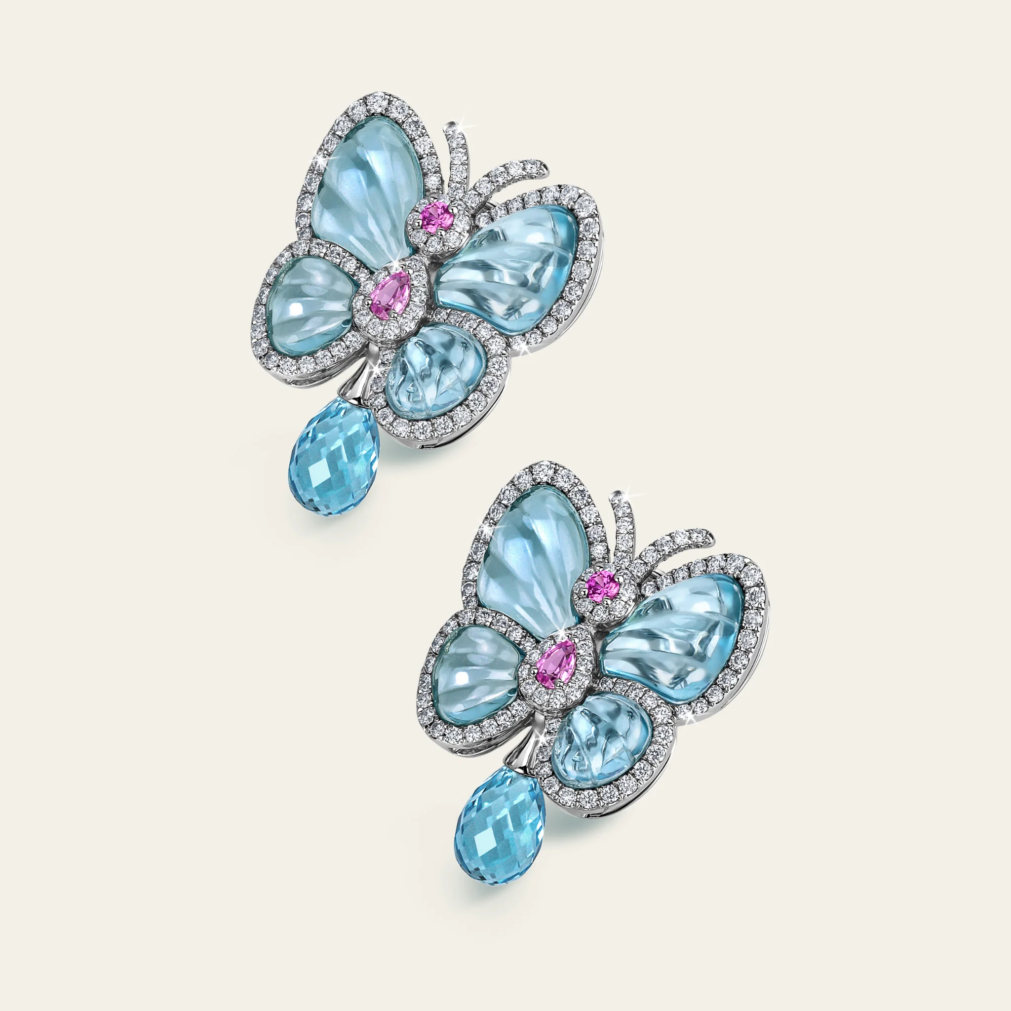 Hand crafted in 18k white gold with blue topaz, pink sapphires, and white diamonds