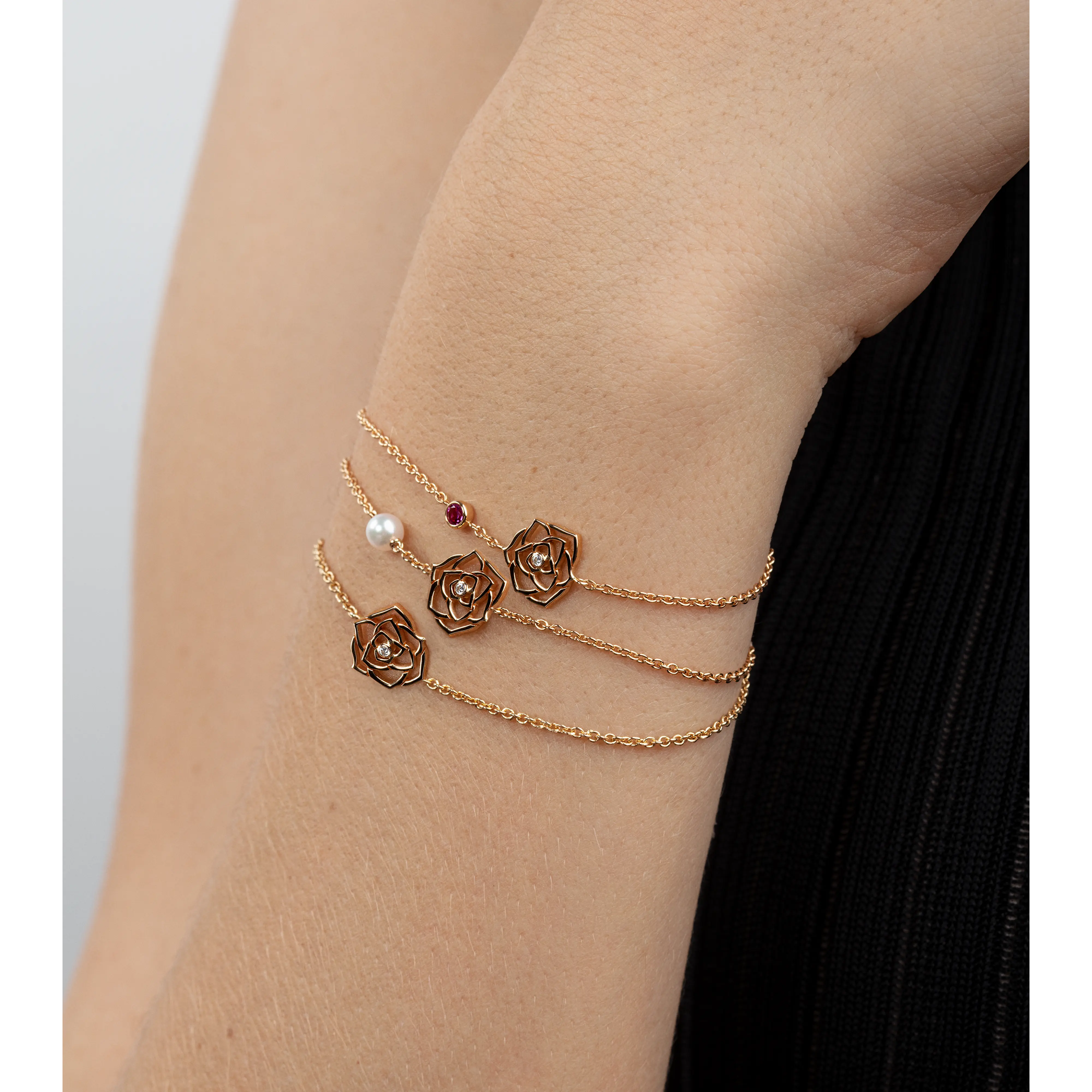 A rose appears, the absolute queen of the Piaget garden. The perfect expression of happiness. With this bracelet Piaget revisits its historic rose, giving it a spirited reinterpretation. A delicious rose unfurls its golden openwork petals in a subtle pink nuance. In a precious touch, a diamond shines at the heart of the flower.