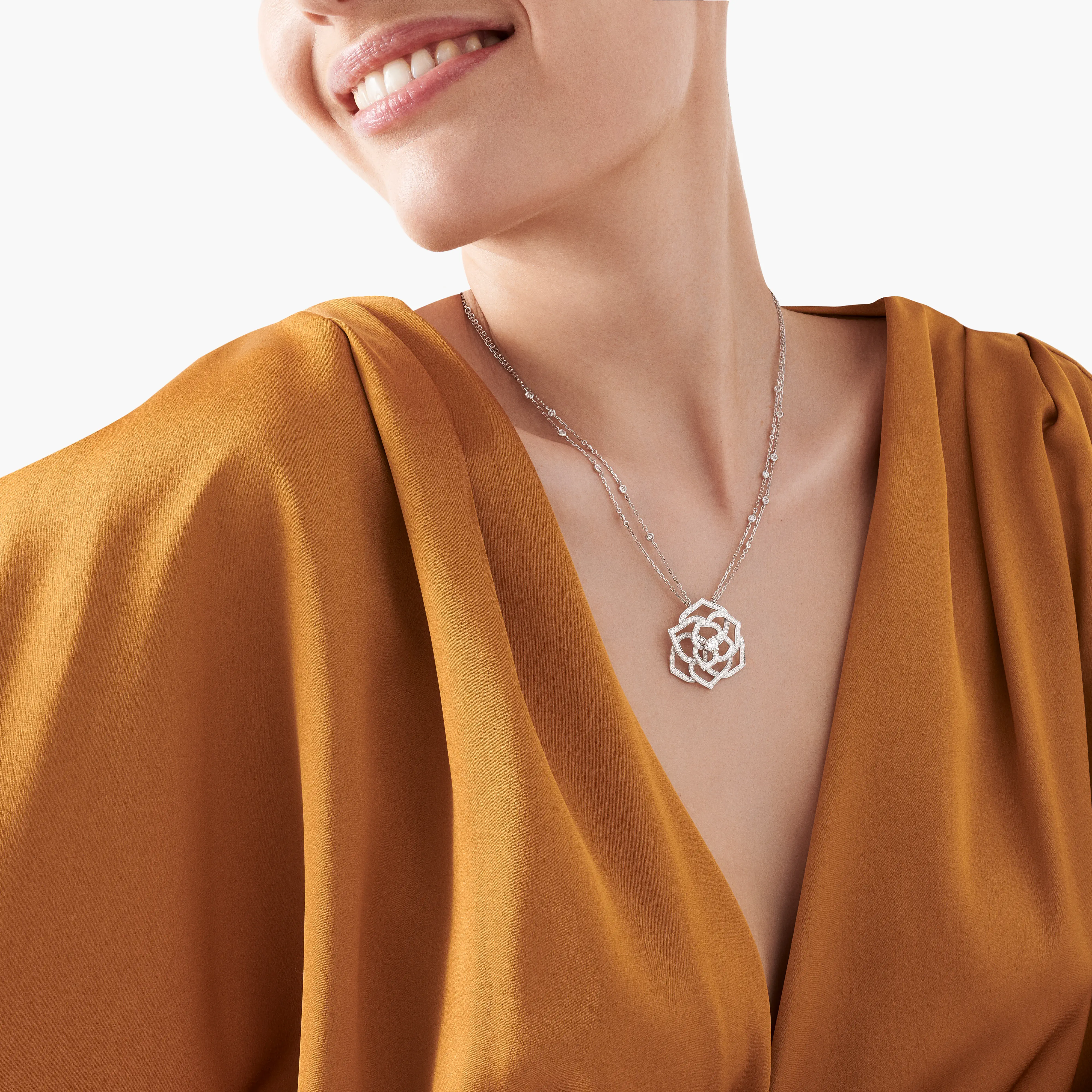 Piaget Rose openwork white gold and diamond pendant on a double chain set with diamonds. In Piaget’s garden where the rose reigns supreme, the uncontested queen of flowers shows off her intense beauty through the poetry of goldsmithing and gem-setting. Glistening with a multitude of diamonds, the generous openwork diamond pendant plays a game of hide and seek with the light. On a double chain set with diamonds, the rose reveals her most glamorous side, forever immortalised as an eternal diamond-paved rose.