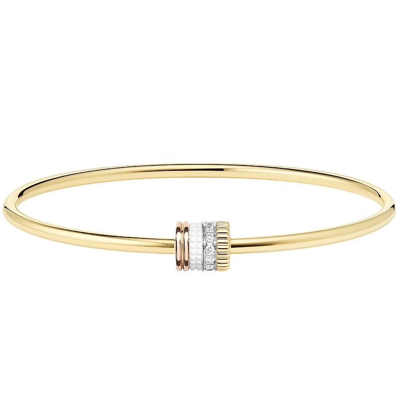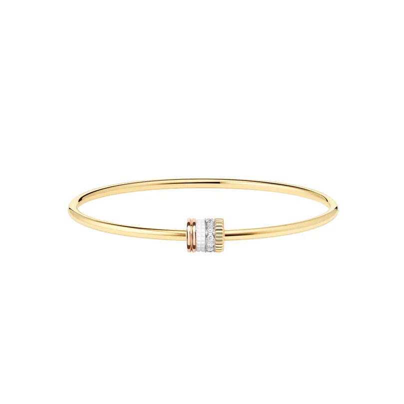 Make a style statement with the Quatre White Edition bracelet on your wrist. Here, the Clou de Paris in white Hyceram luminates and contrasts with the Grosgrain in yellow gold and the line of diamonds. The Double Godron in pink gold rounds off the combination of materials and colors that make this collection a timeless jewelry icon. Combine with other bracelets and colors to enhance the power of Quatre.
