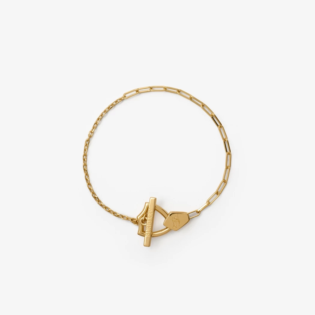 A bracelet made in Italy from brass with gold plating, constructed from chain links in contrasting sizes. The T-bar is secured with a shield shape inspired by our Equestrian Knight Design.