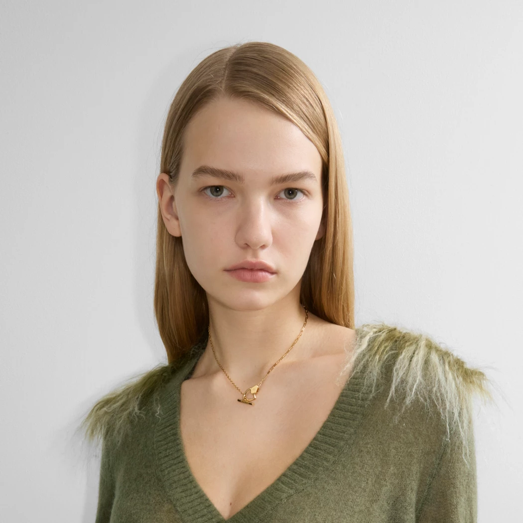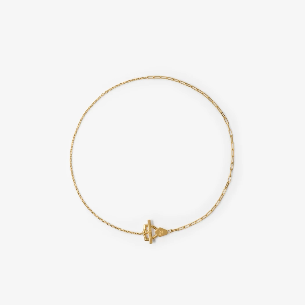 A necklace made in Italy from brass with gold plating, constructed from chain links in contrasting sizes. The T-bar is secured with a shield shape inspired by our Equestrian Knight Design.
